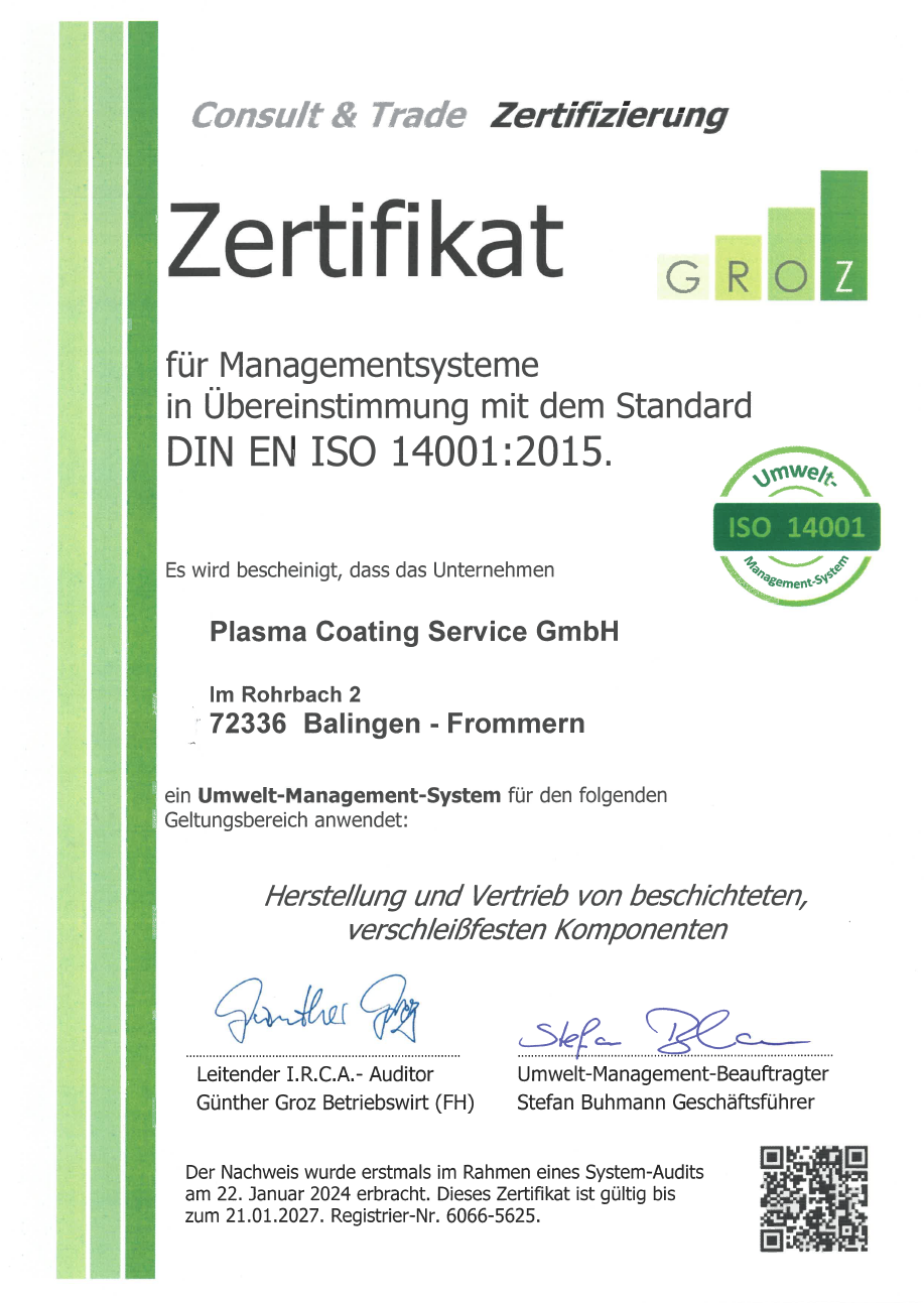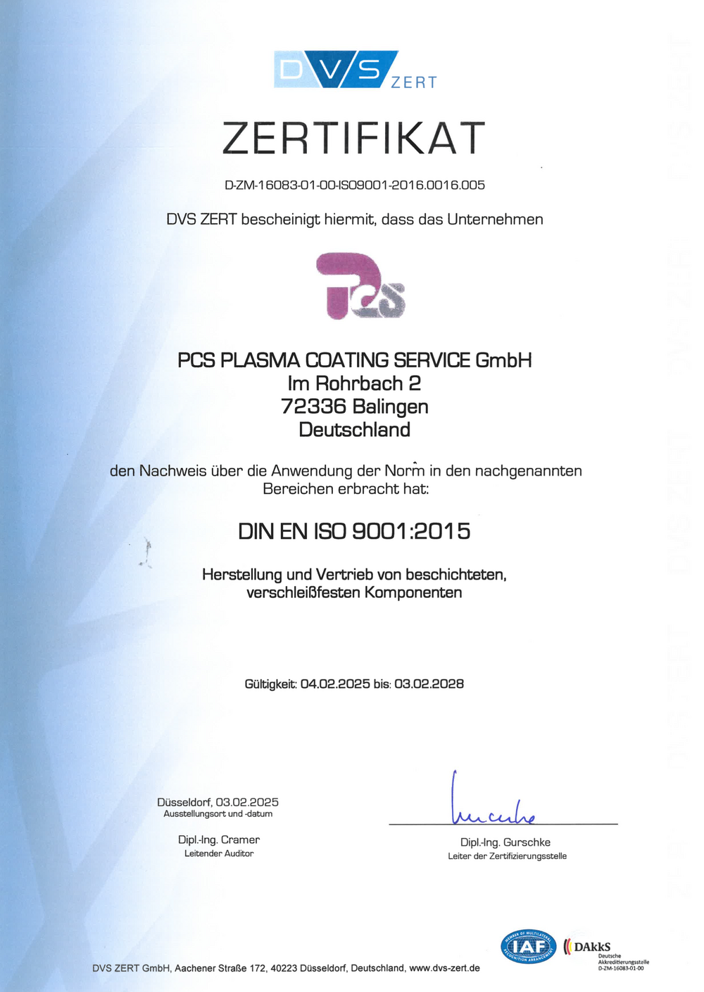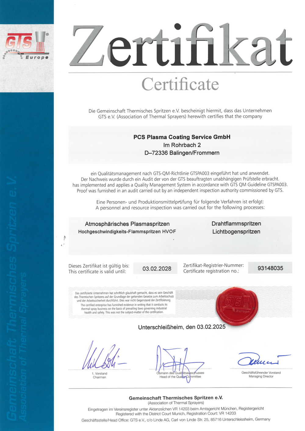 Qualität hat bei der Plasma Coating Service GmbH einen hohen Stellenwert und bildet die Basis unserer Unternehmensphilosophie. Aus diesem Grund verfügen wir über ein durchgängiges Qualitätsmanagement-System und sind nach DIN EN ISO 9001:2015 zertifiziert. Des Weiteren ist die Plasma Coating Service GmbH Mitglied der GTS „Gemeinschaft Thermisches Spritzen e.V“. Das GTS-Zertifikat dokumentiert eine Produkt-, Personal- und Verfahrensprüfung durch ein neutrales und unabhängiges Institut.